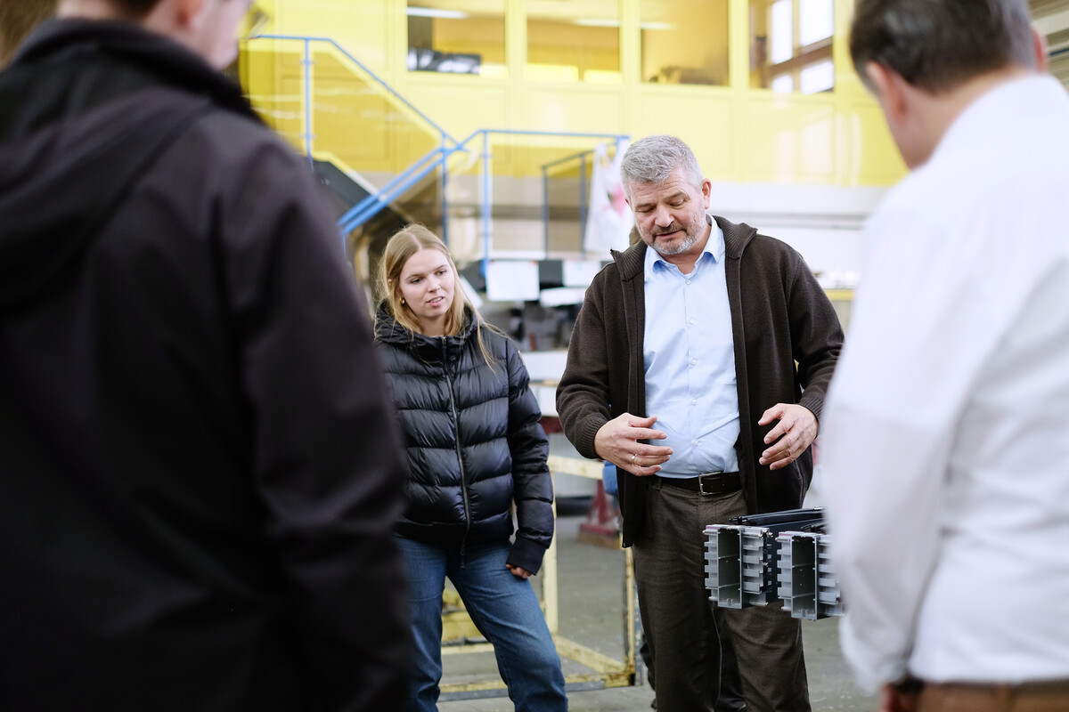 Im Anschluss folgte ein Rundgang durch die Produktion. Zu Beginn wurde die Materialanlieferung gezeigt, einschließlich des Strahlprozesses mit Metallkügelchen zur Oberflächenreinigung. Danach erhielten wir Einblicke in die Technikabteilung, in der die Ausführung auf Basis der Architektenpläne detailliert geplant wird.